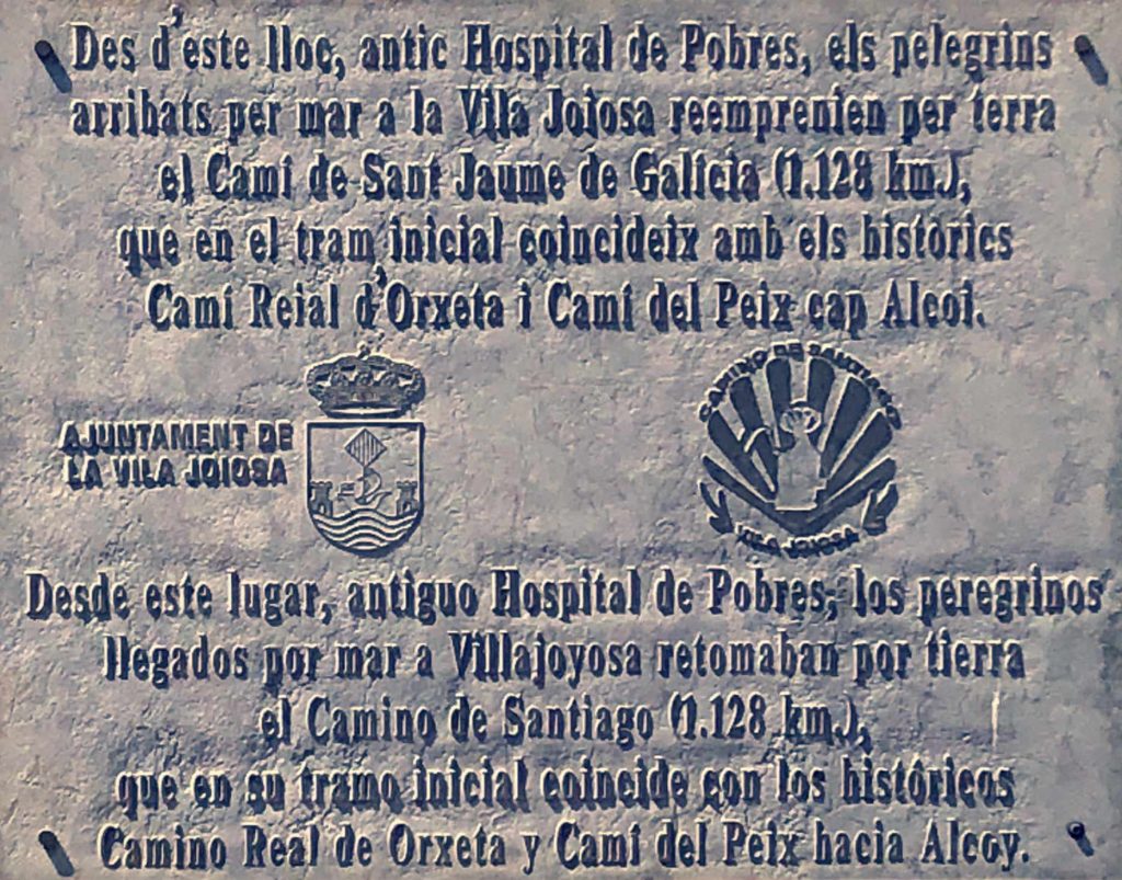 El «Punto Cero» de tu Camino en Villajoyosa se sitúa en la Placeta del Médico Miguel Ruiz Galiana ,conocida como la Placeta de la Fuente del Ayuntamiento, colindando con la entrada principal de la Sede de Mariners Club, lugar donde en su proximidades se situaba el Hospital que albergaba a todos los Peregrinos enfermos que provenían en modestas barcazas tras duras travesías de diferentes orígenes surcando las aguas turquesas del Mediterráneo en busca de esperanza de sanación y veneración al Santo Apóstol.